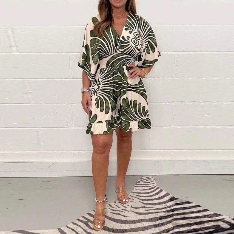 Summer European And American Fashion Foreign Trade Women's Clothing Hot-selling Floral-print Backless Lace-up Jumpsuit