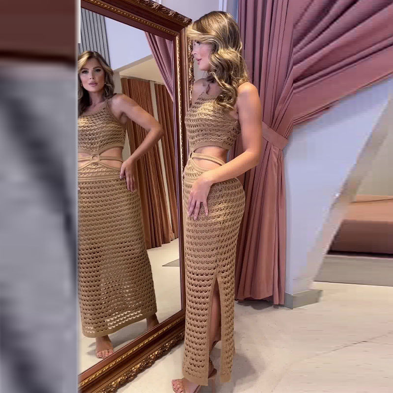 Women's Clothing Solid Color Round Neck Sexy Hollow Hot Girl Hip Bag Dress